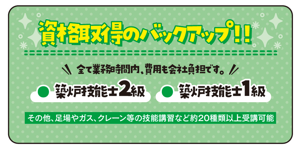 | 事業内容 | ボイラー、工業炉その他各種築炉工事一式、石油プラント耐火工事一式 各種都市ごみ焼却炉工事一式、足場工事一式、耐火レンガ、赤レンガ販売 |